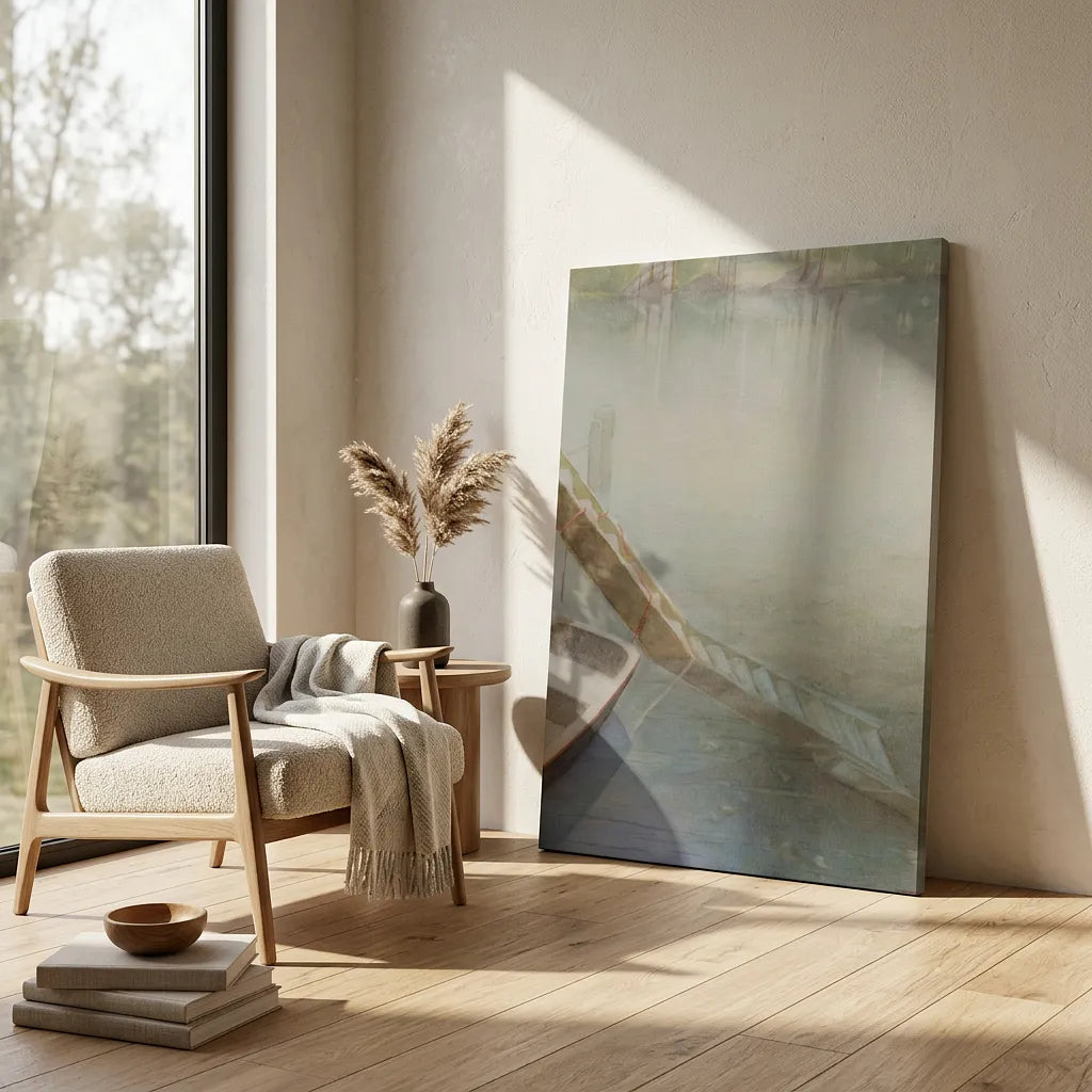 “Foschia sul Lago” evokes the stillness of early morning light over a quiet lake, where mist hangs like breath on glass. This delicate watercolor captures the solitude of a docked rowboat and the soft gradients of water and air. A perfect piece for creating a serene, contemplative space, this artwork invites the viewer to pause and exhale—ideal for bedrooms, reading nooks, or meditation corners.