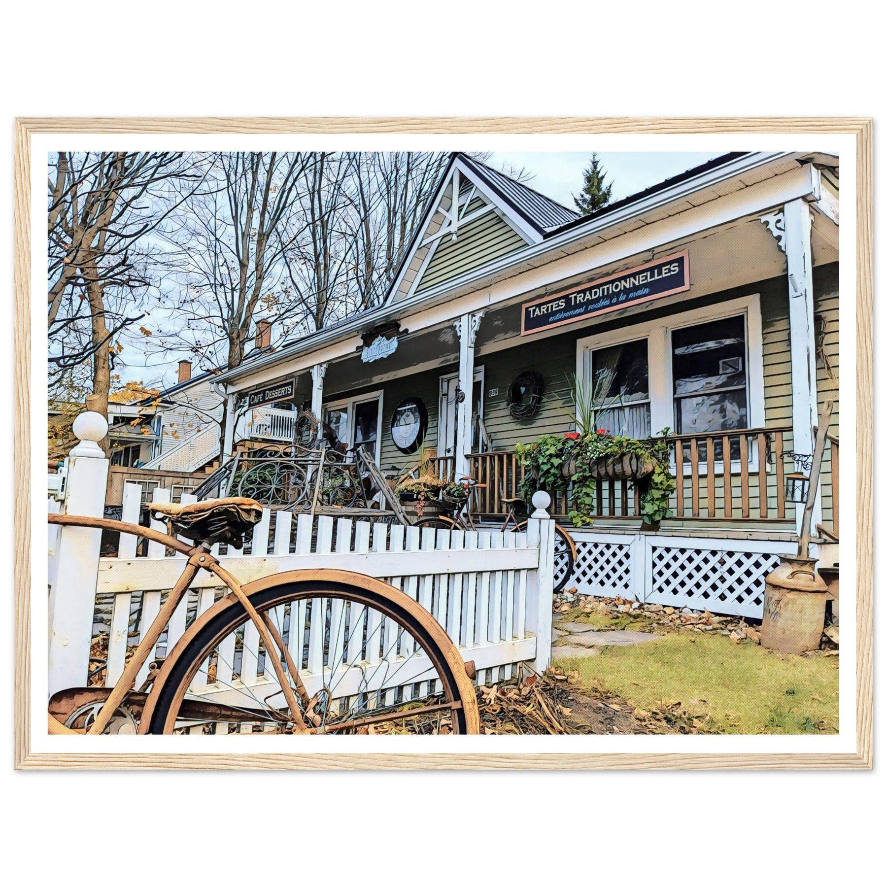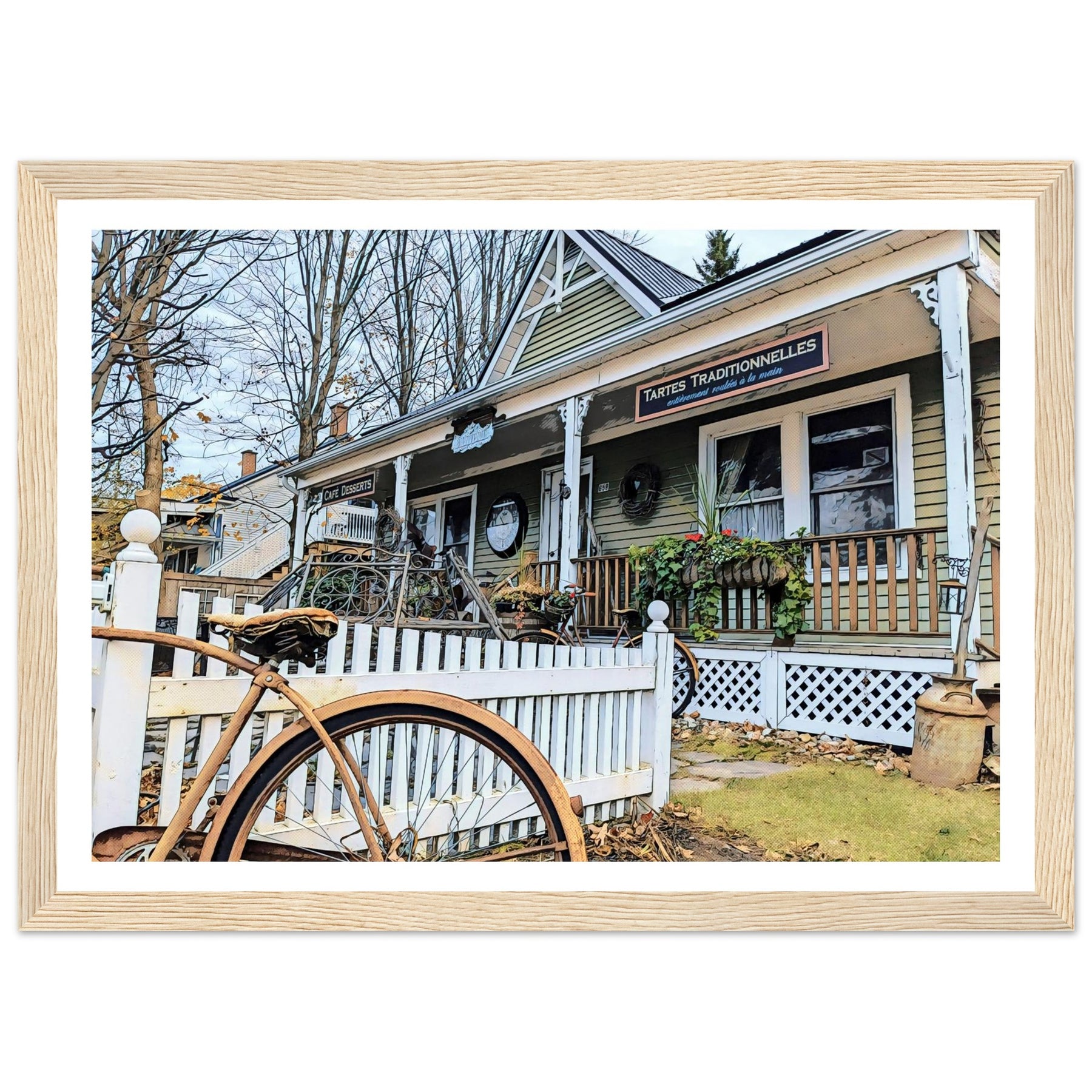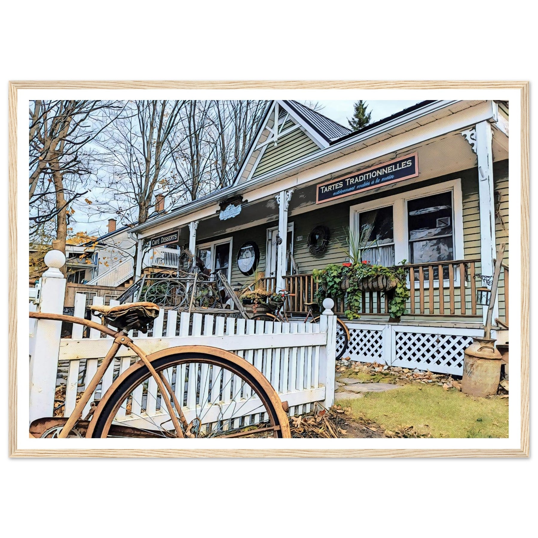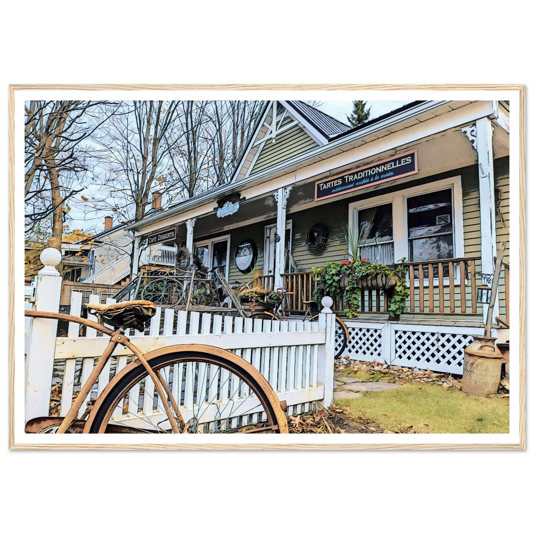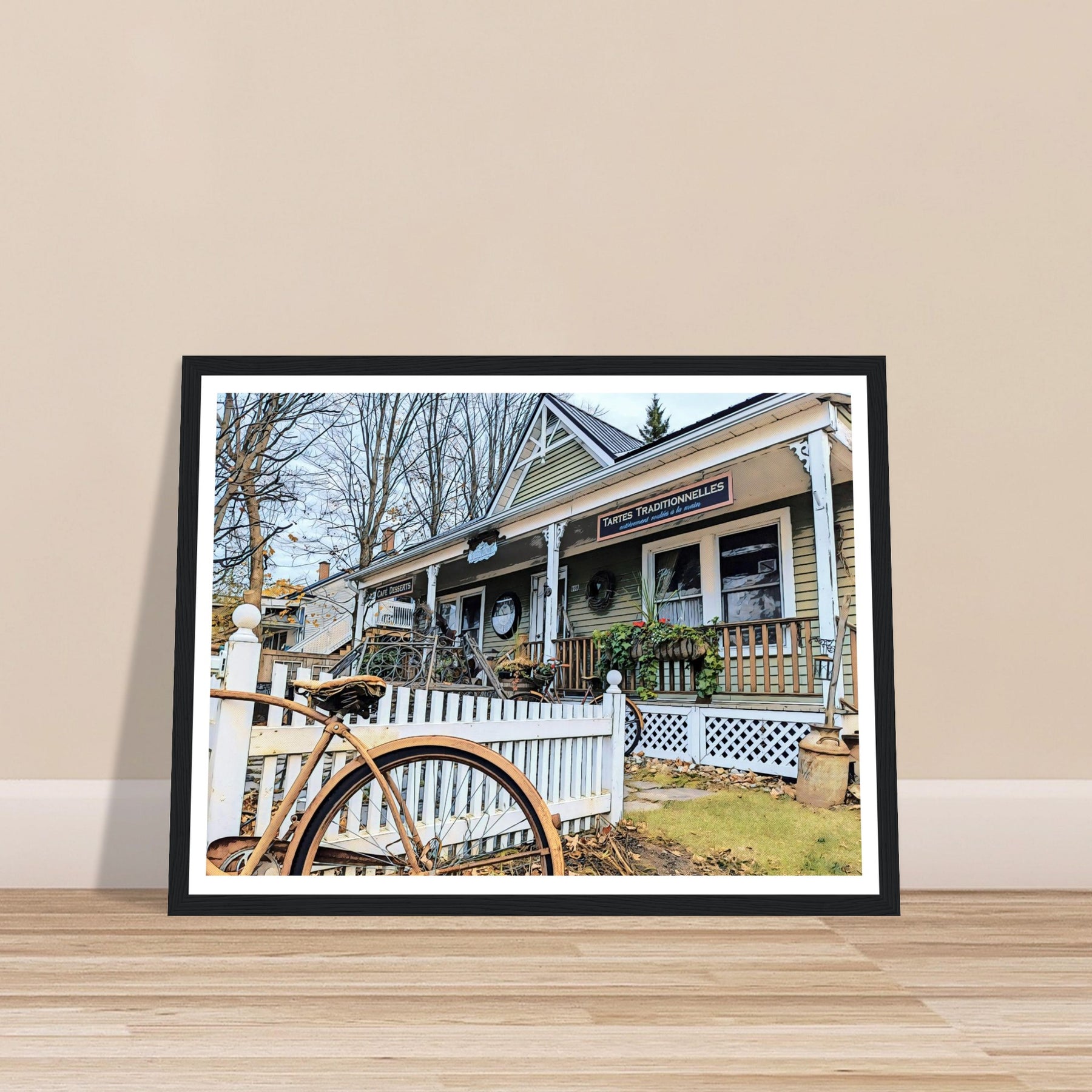 Charming Bakery Scene with Antique Bicycle in Bromont - Premium Matte Wooden Framed Print