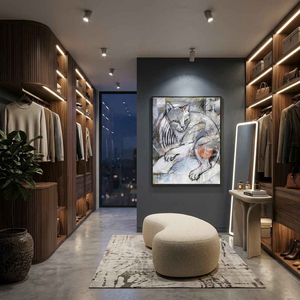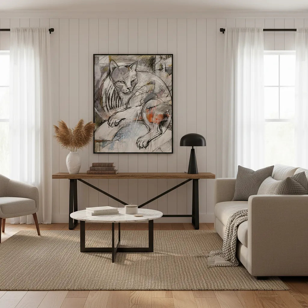 Add a touch of feline character to your walls with this Modern Expressionist Grey Cat Sketch. This piece features bold, gestural lines and a neutral palette of greys, whites, and subtle earth tones. The cat's attentive gaze and relaxed posture are captured in a fluid, illustrative style that blends seamlessly with minimalist or modern decor. Ideal for creating a sophisticated focal point in a living room, office, or bedroom.
