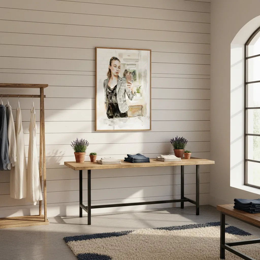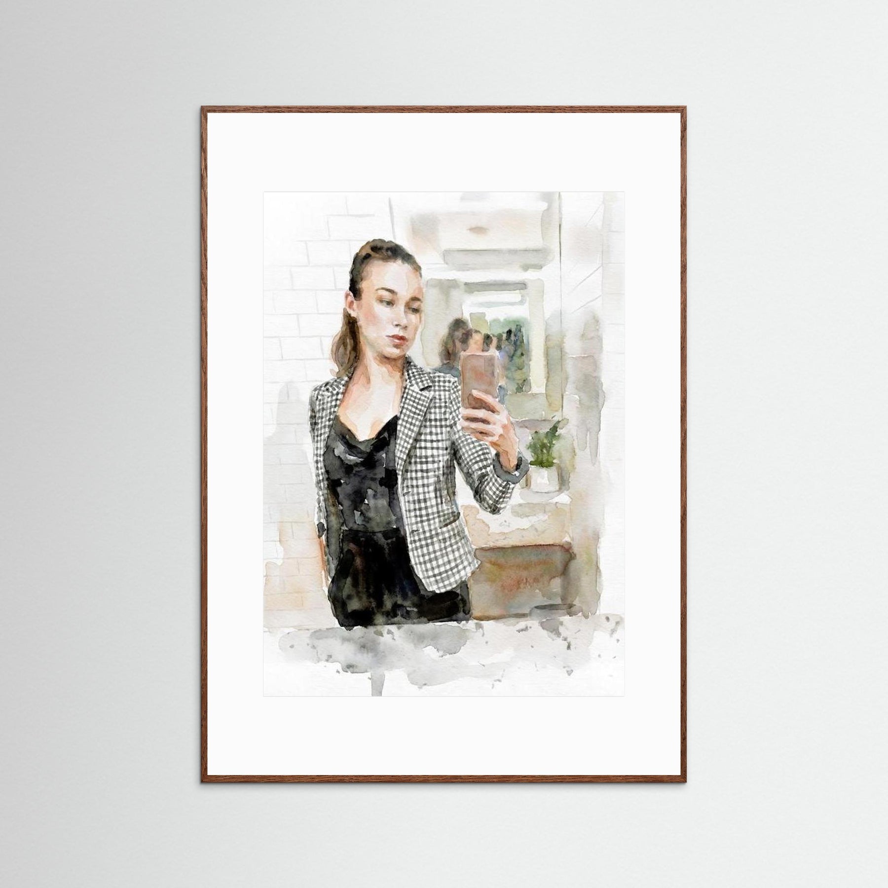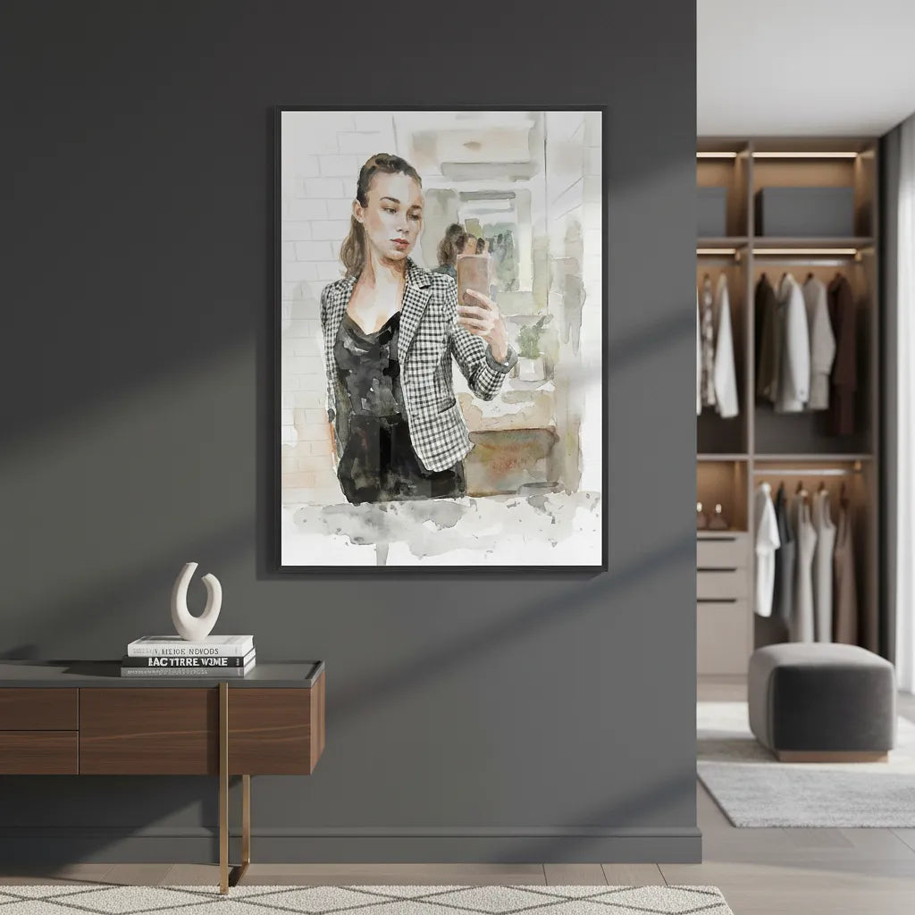 “Modern Muse” portrays a quiet moment of contemporary femininity — a poised woman framed in soft watercolor textures and architectural light. The black dress contrasts beautifully against the delicate plaid blazer, creating a refined balance of strength and softness.