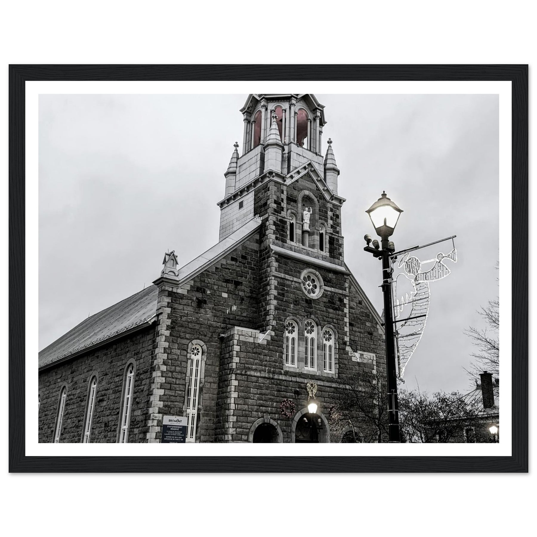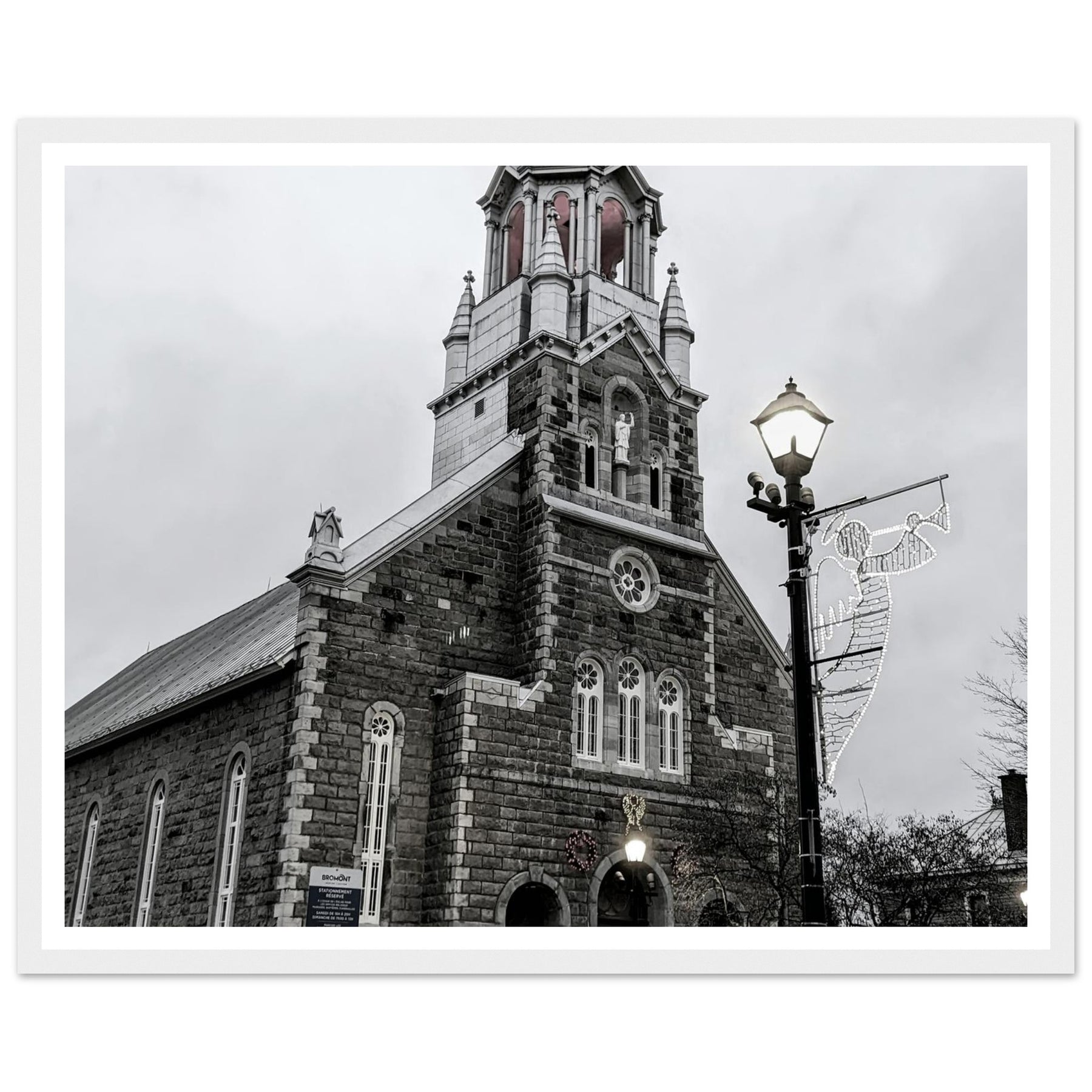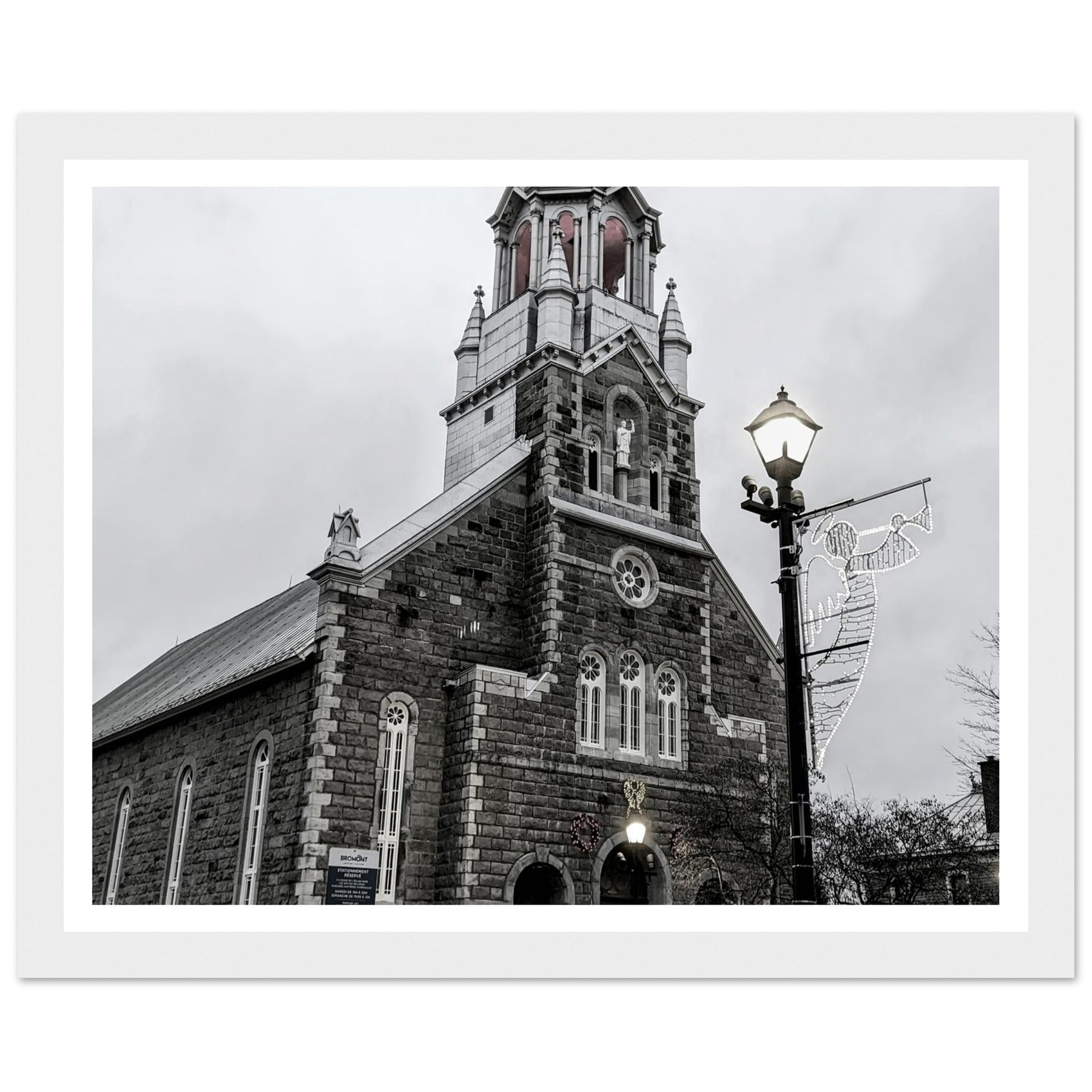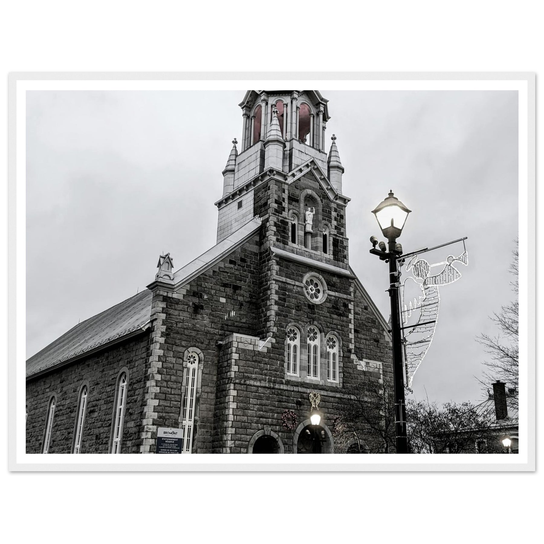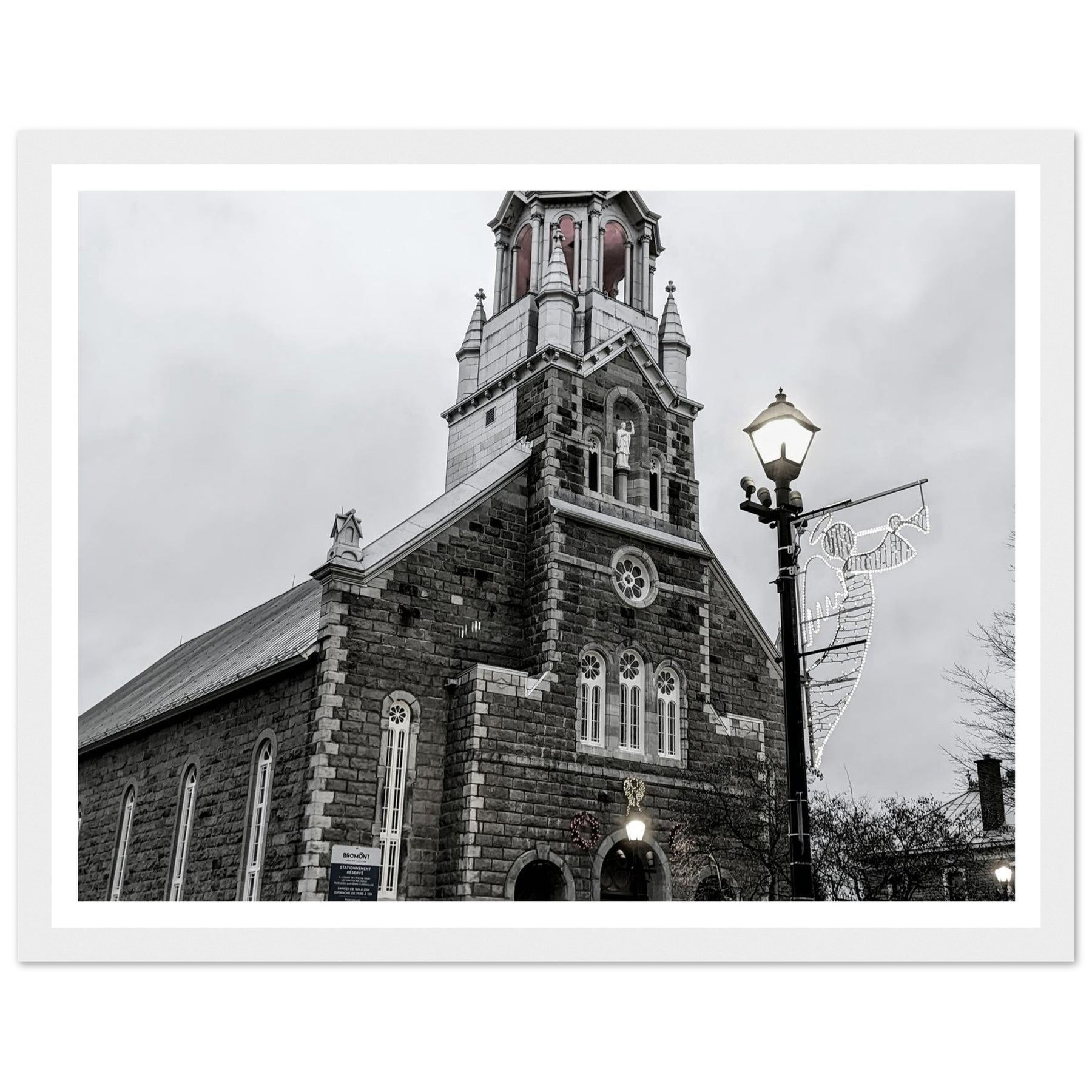 Immerse yourself in the peaceful atmosphere of this stunning monochrome artwork featuring Bromont Church at dusk. Captured in elegant tones of grey, this piece evokes feelings of serenity and nostalgia, ideal for homes, offices, or serene settings that seek tranquility.