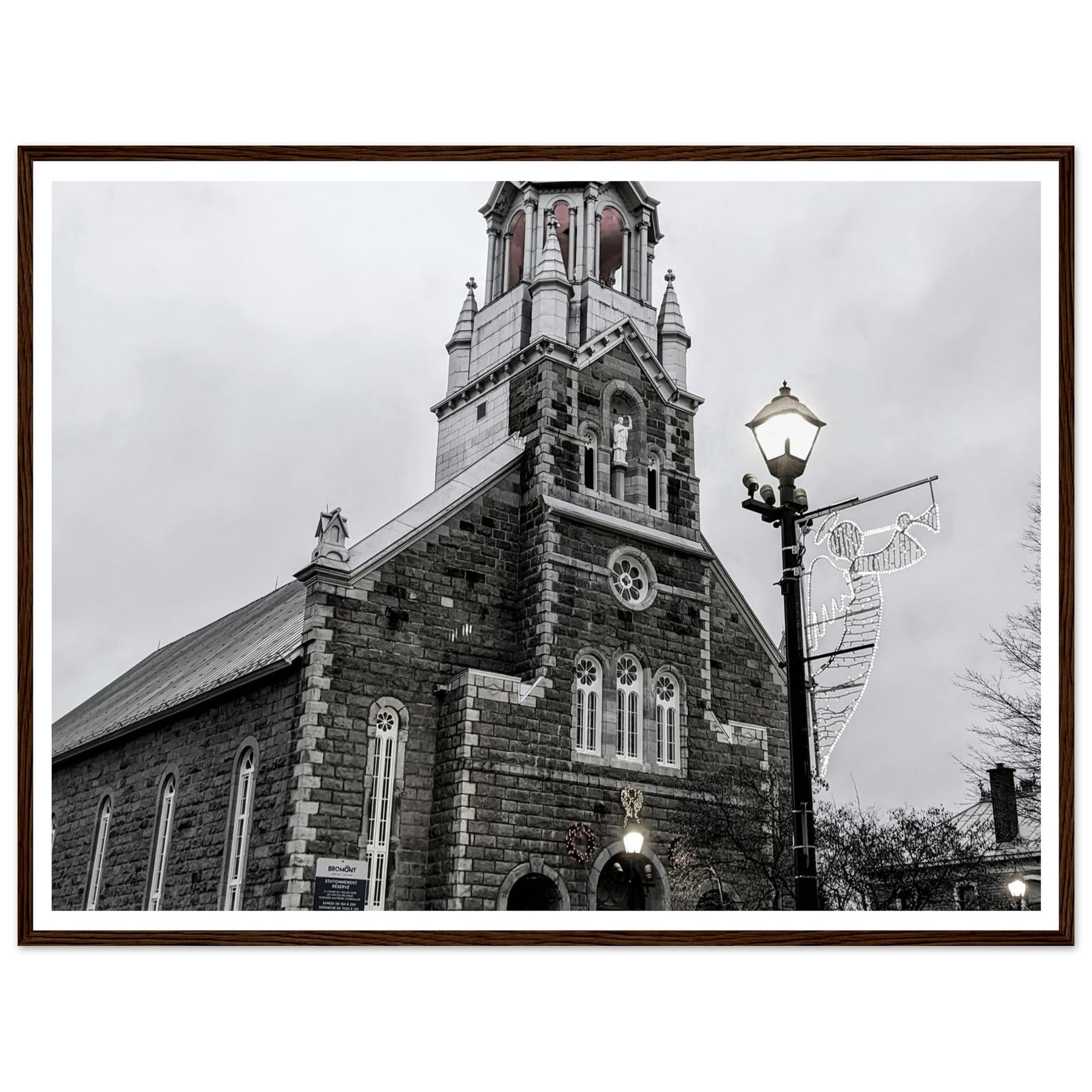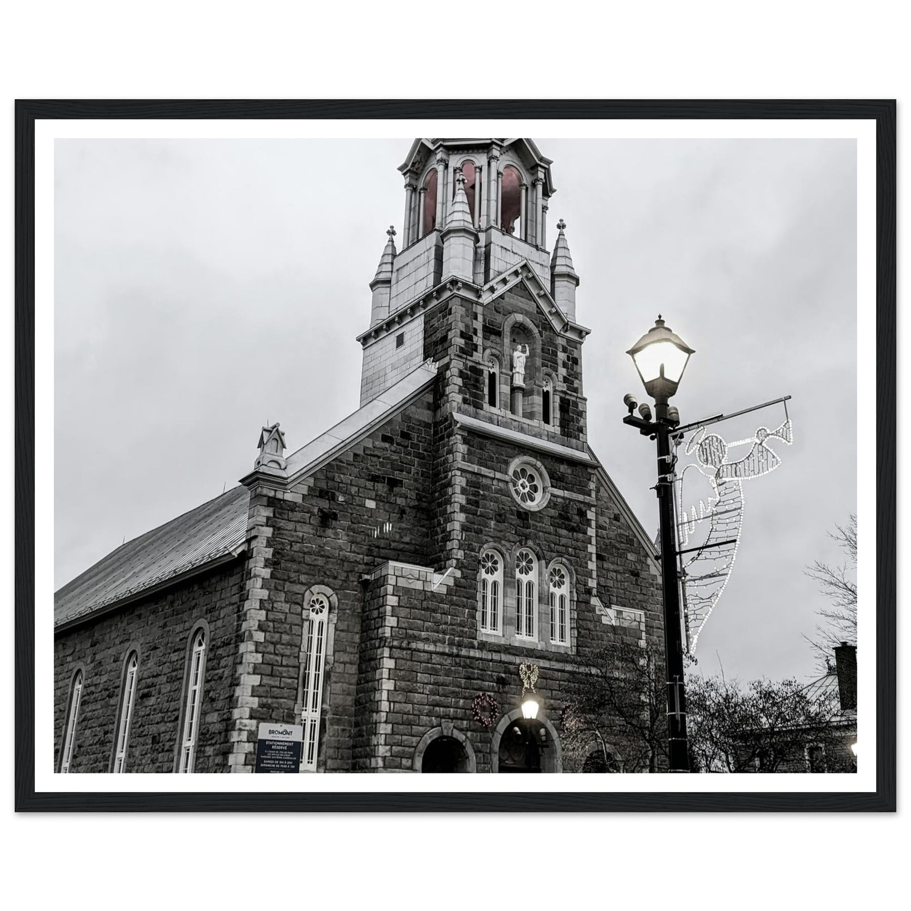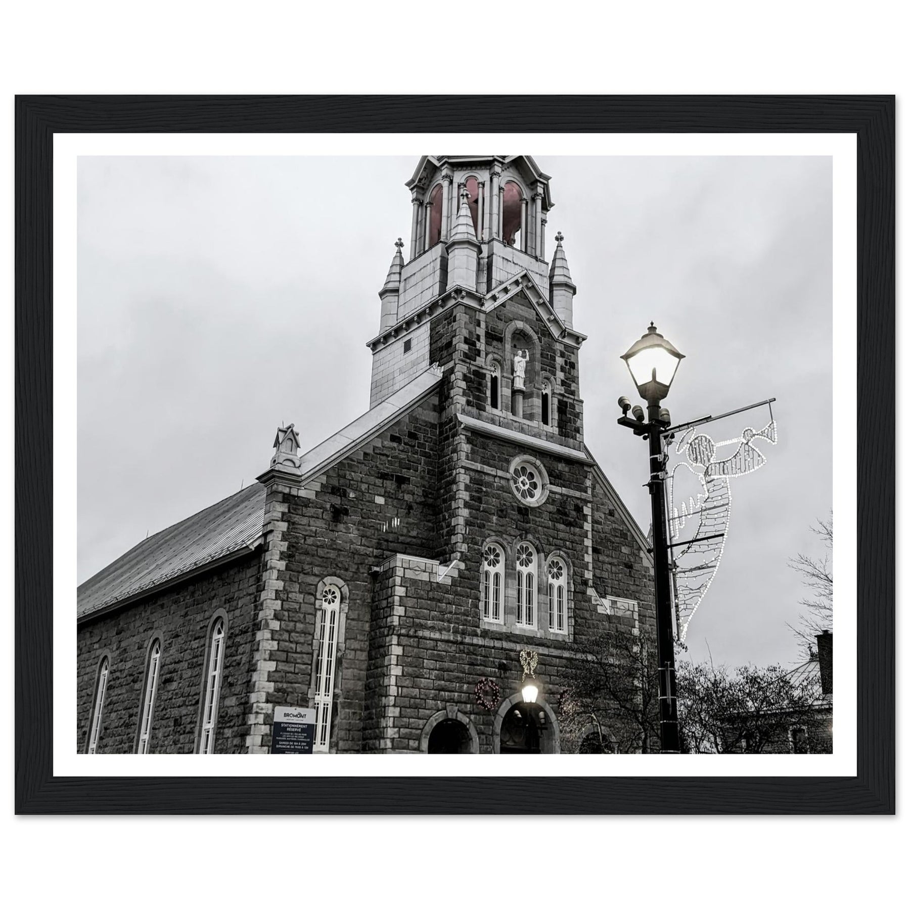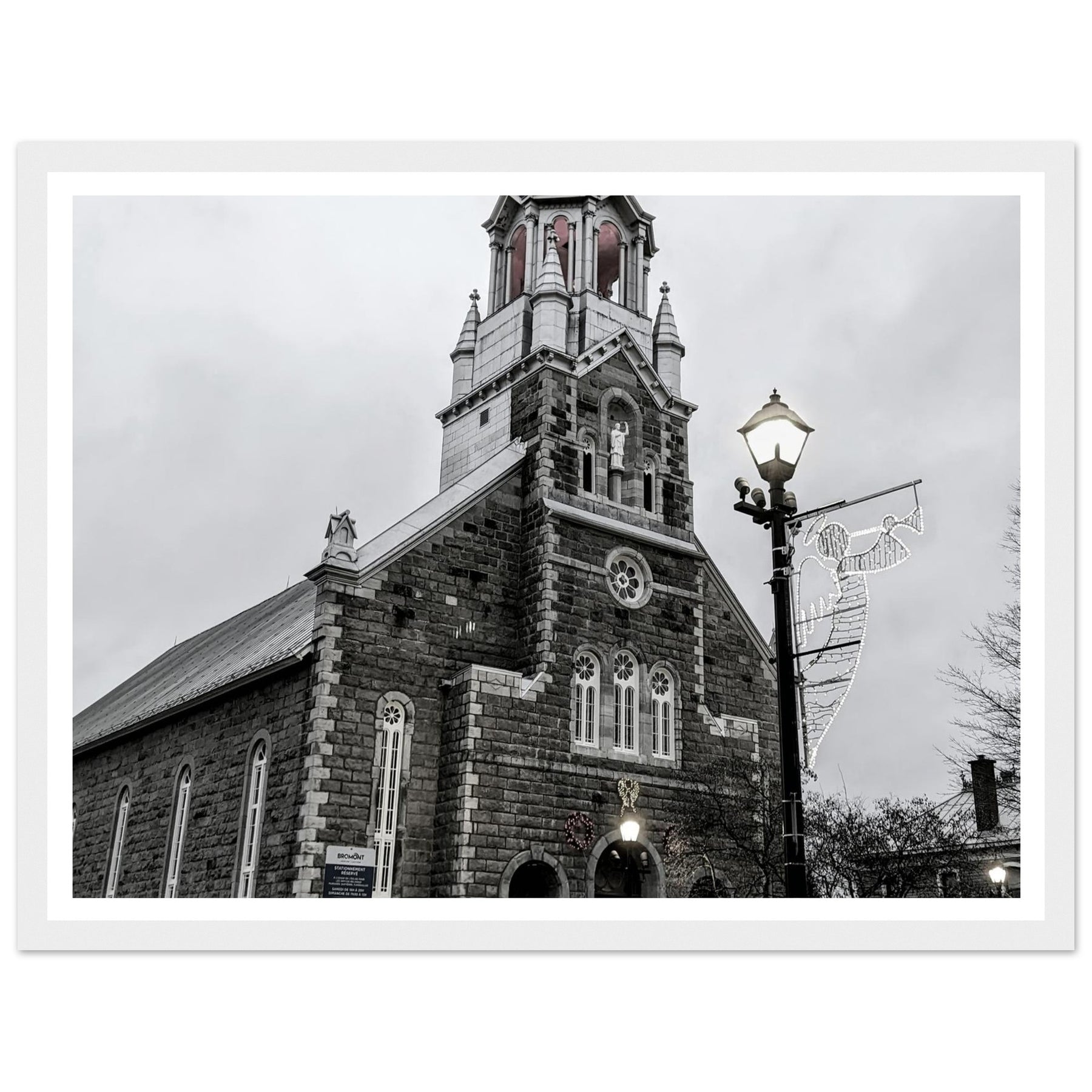 Immerse yourself in the peaceful atmosphere of this stunning monochrome artwork featuring Bromont Church at dusk. Captured in elegant tones of grey, this piece evokes feelings of serenity and nostalgia, ideal for homes, offices, or serene settings that seek tranquility.