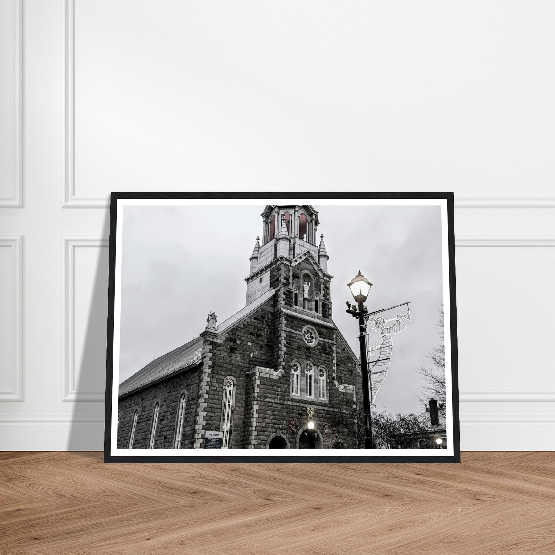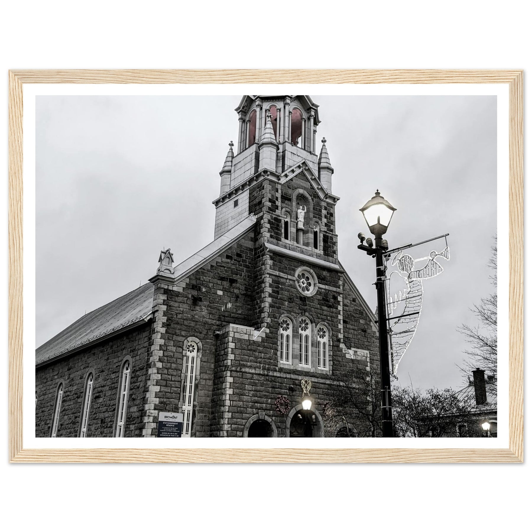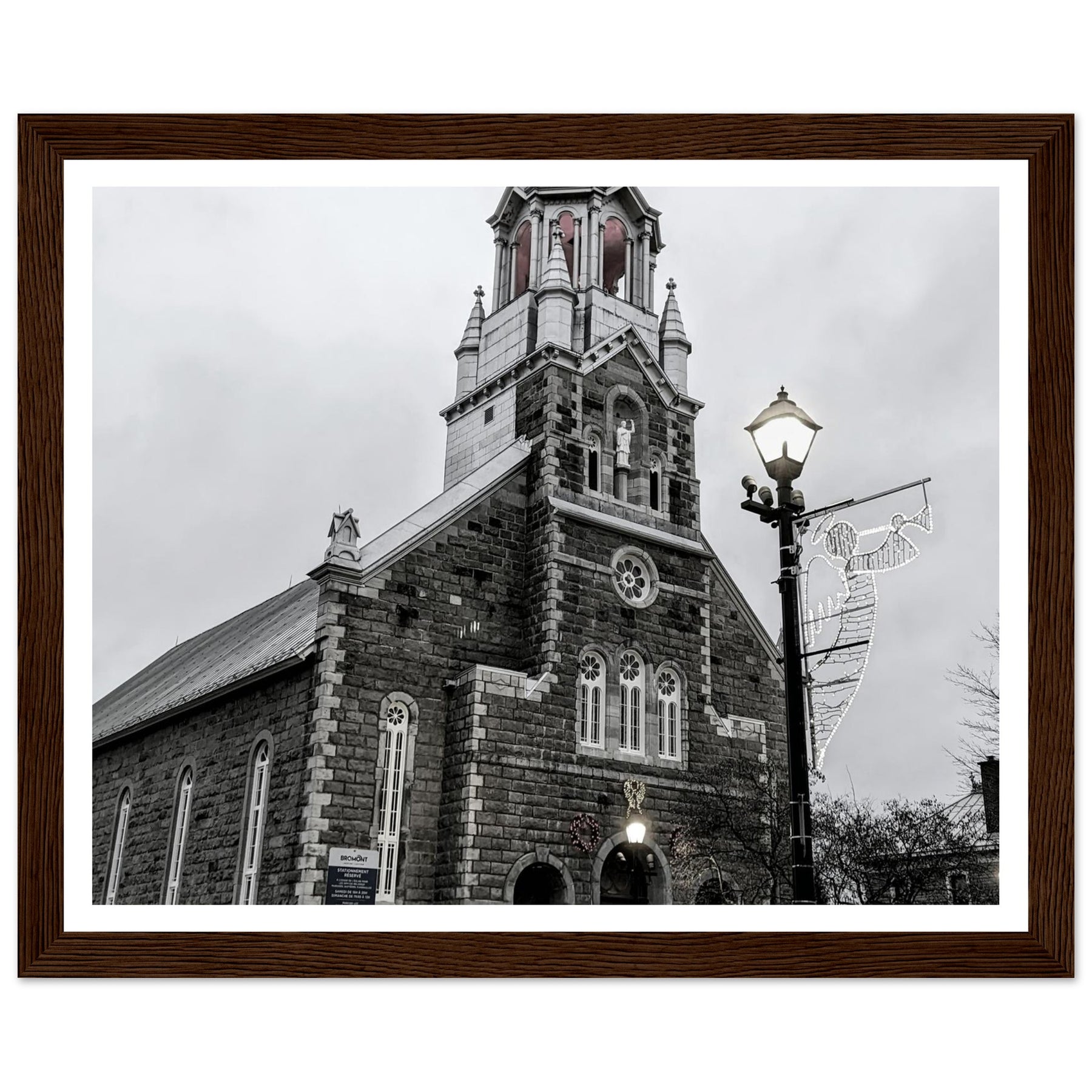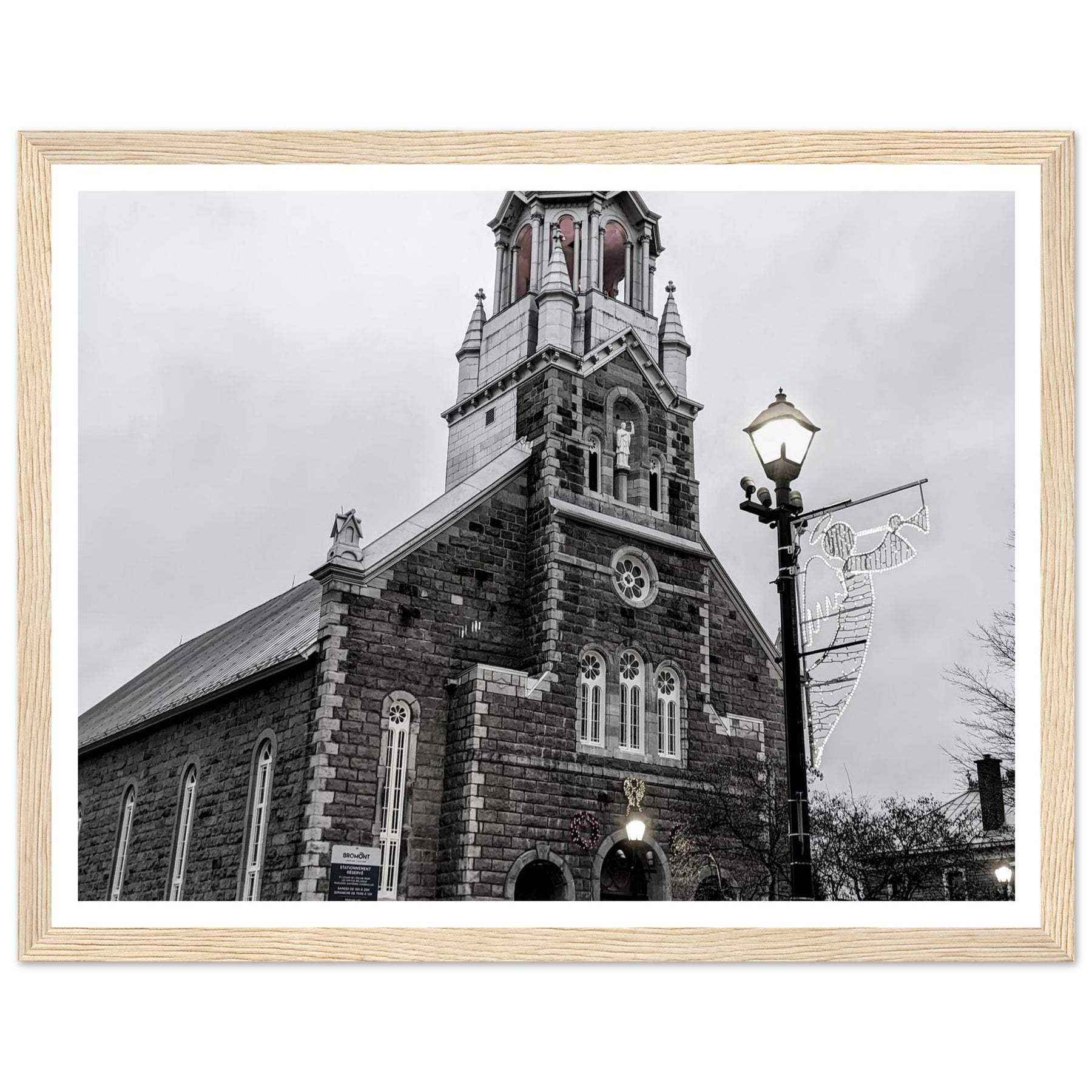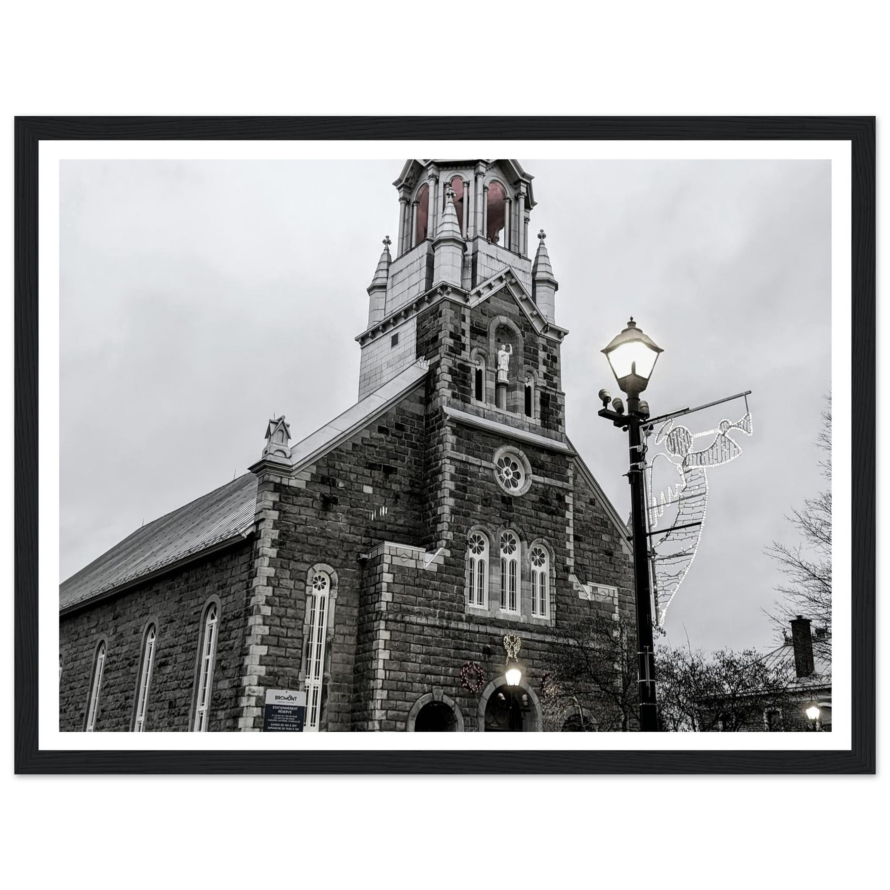 Immerse yourself in the peaceful atmosphere of this stunning monochrome artwork featuring Bromont Church at dusk. Captured in elegant tones of grey, this piece evokes feelings of serenity and nostalgia, ideal for homes, offices, or serene settings that seek tranquility.