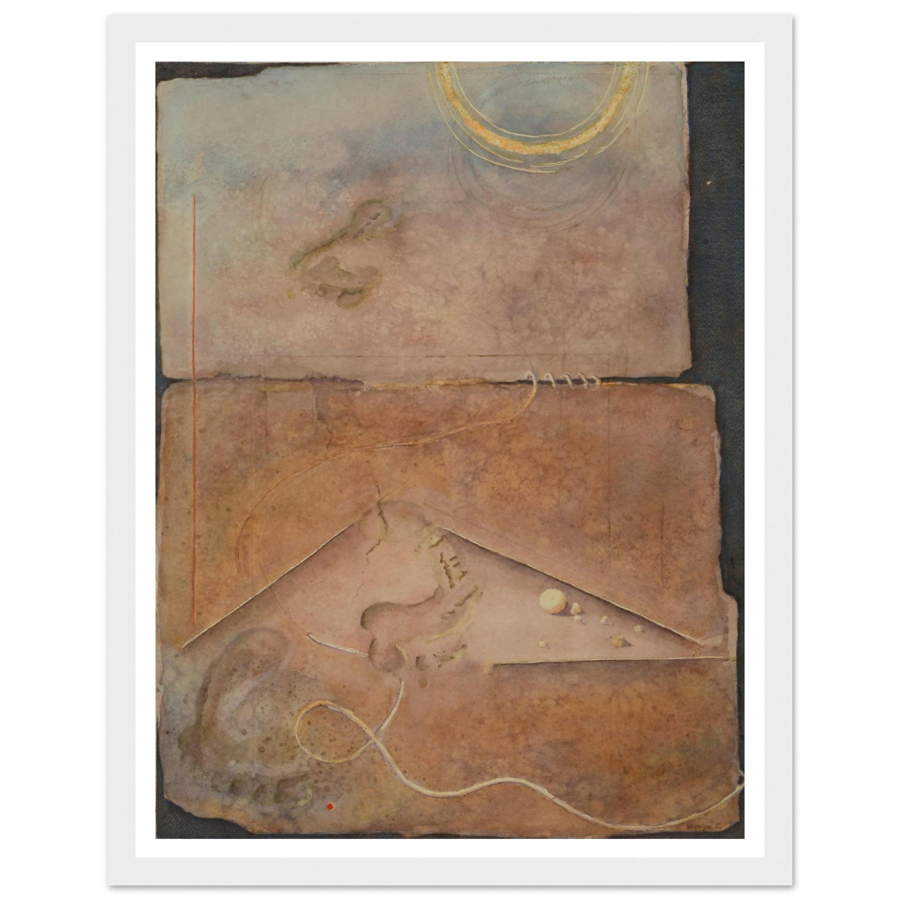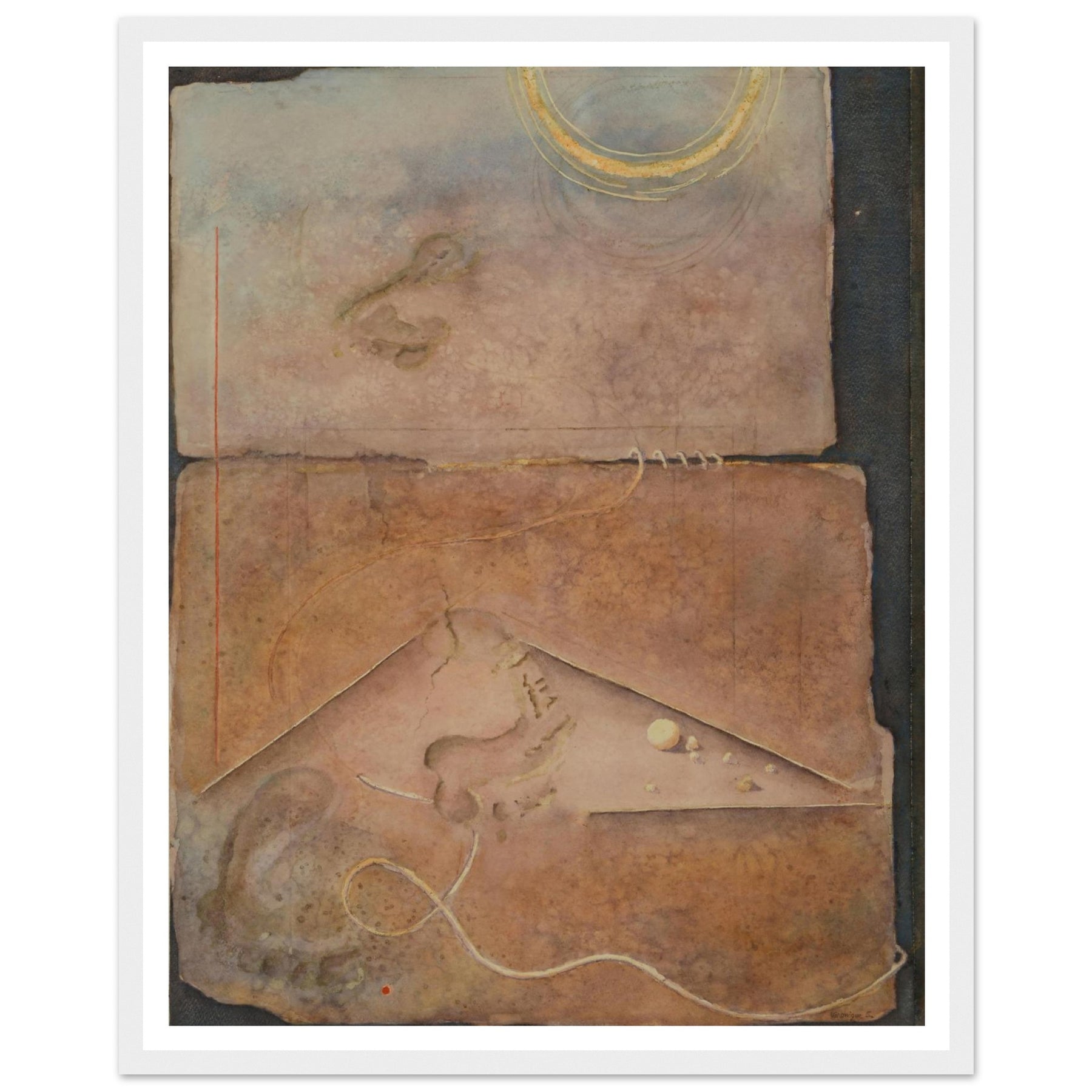 “Ieri, Oggi e Domani” reads like a visual palimpsest—layers of time, memory, and terrain inscribed across earthen textures. Abstract forms echo footprints, constellations, and eroded markings, as if unearthed from an ancient archive. Golden rings and subtle lines hint at celestial cycles and human traces, linking past, present, and future through a quiet visual language. This contemplative piece invites the viewer to reflect on continuity and impermanence, mapping a symbolic geography where time moves in spirals rather than lines