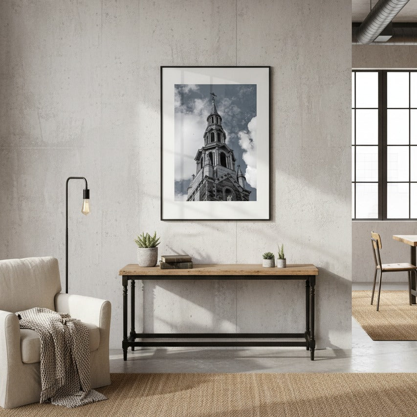 Tableau élégant représentant un clocher d'église - Impression encadrée en bois mat de qualité supérieure