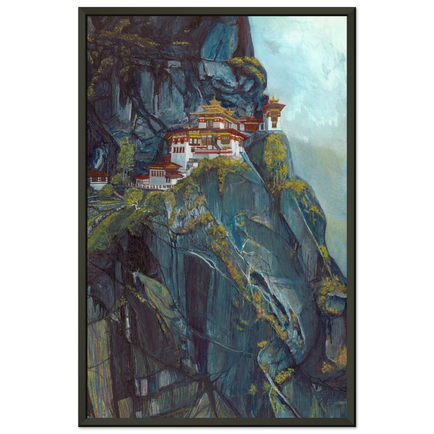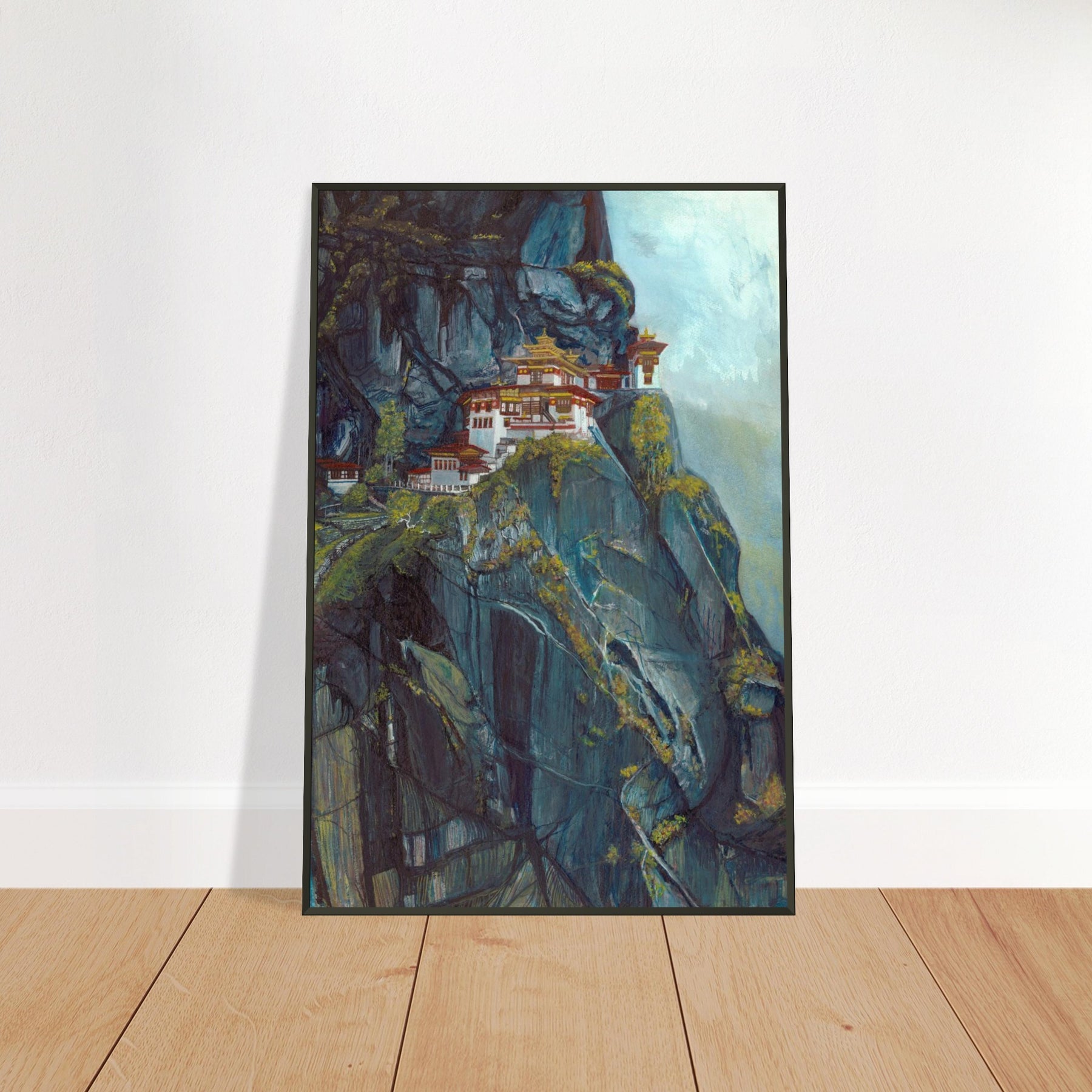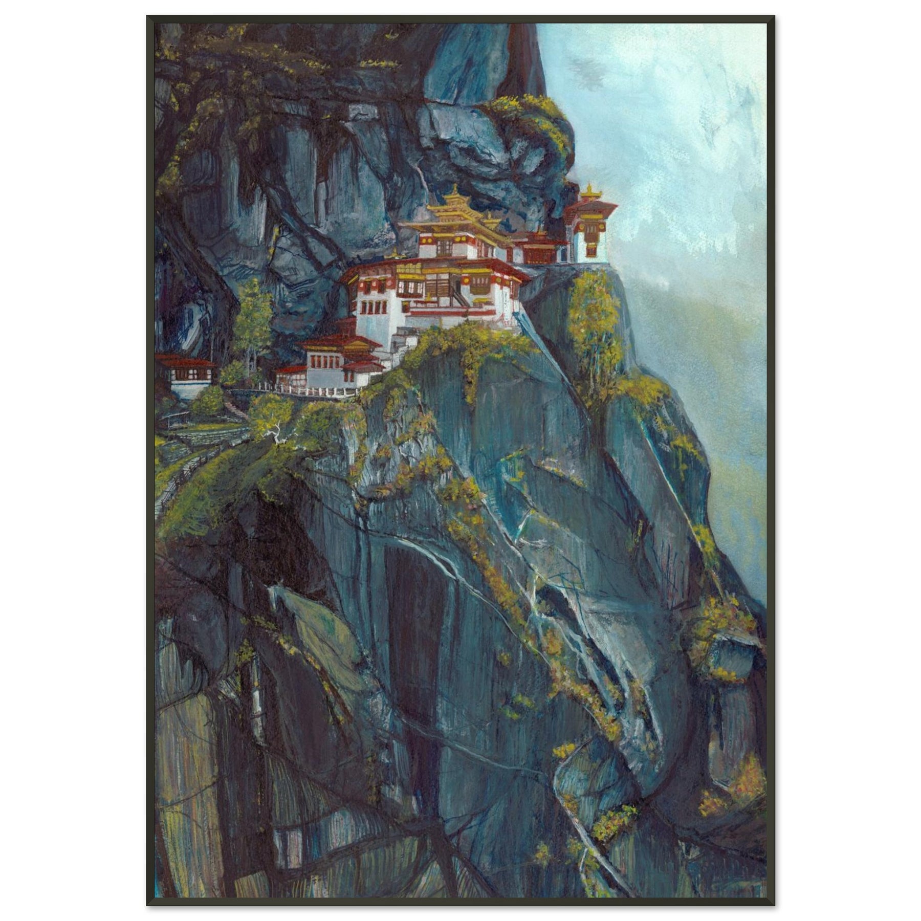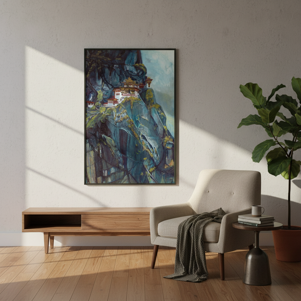 Experience the tranquil allure of Bhutan’s Taktsang Monastery with this exquisite watercolor painting. This artwork beautifully captures the monastery's unique architecture against the backdrop of towering cliffs, highlighting the interplay of light and shadow.