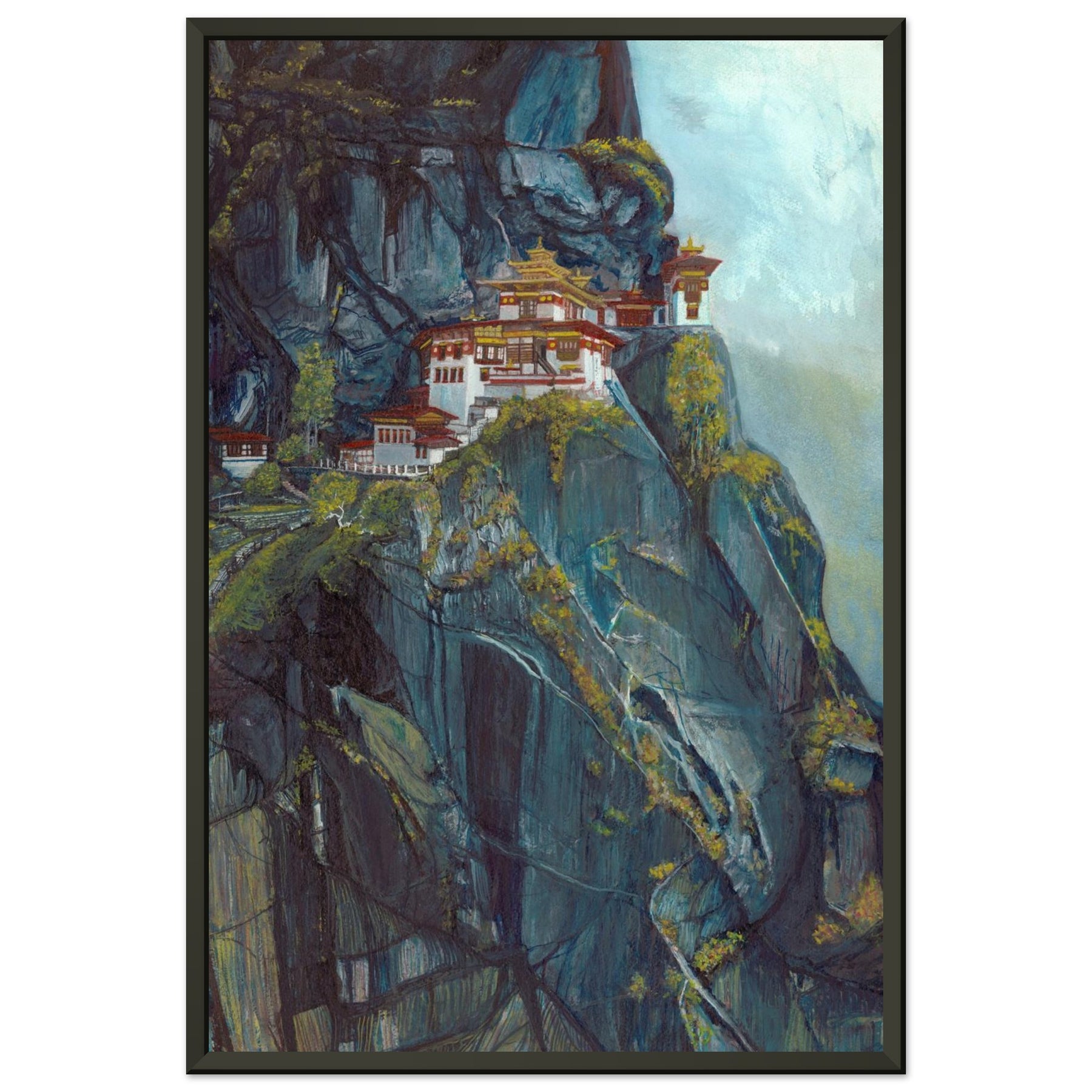 Majestic Heights: Watercolor of Taktsang Monastery - Premium Matte Metal Framed Print