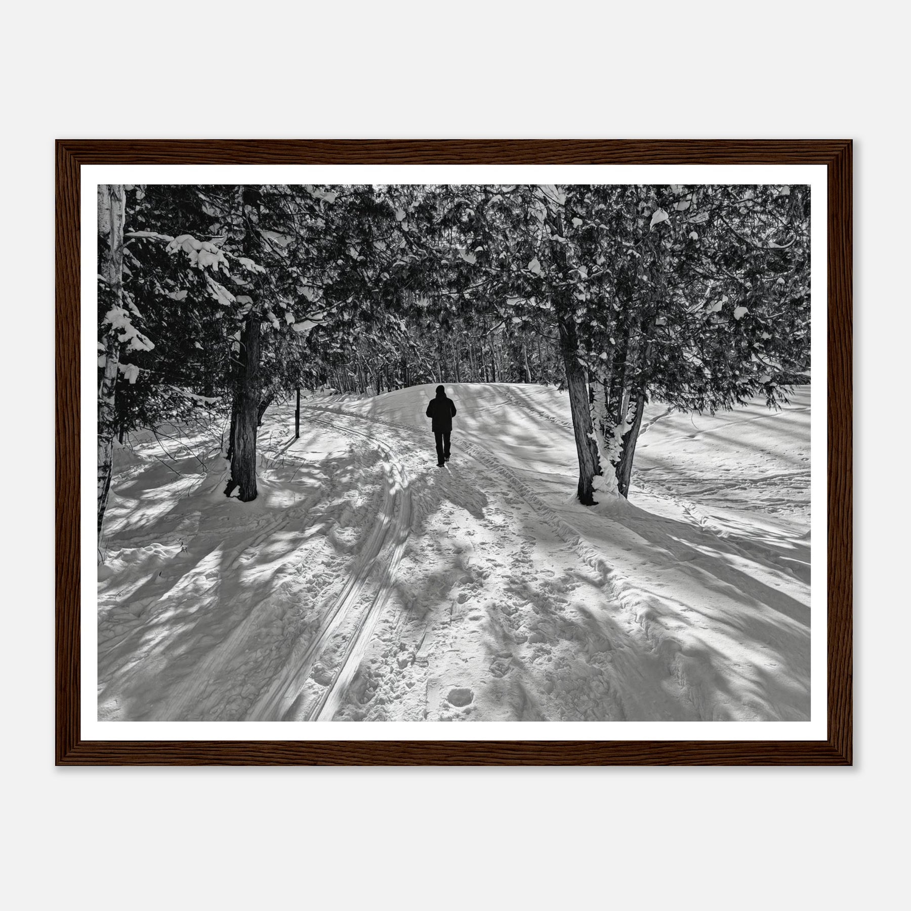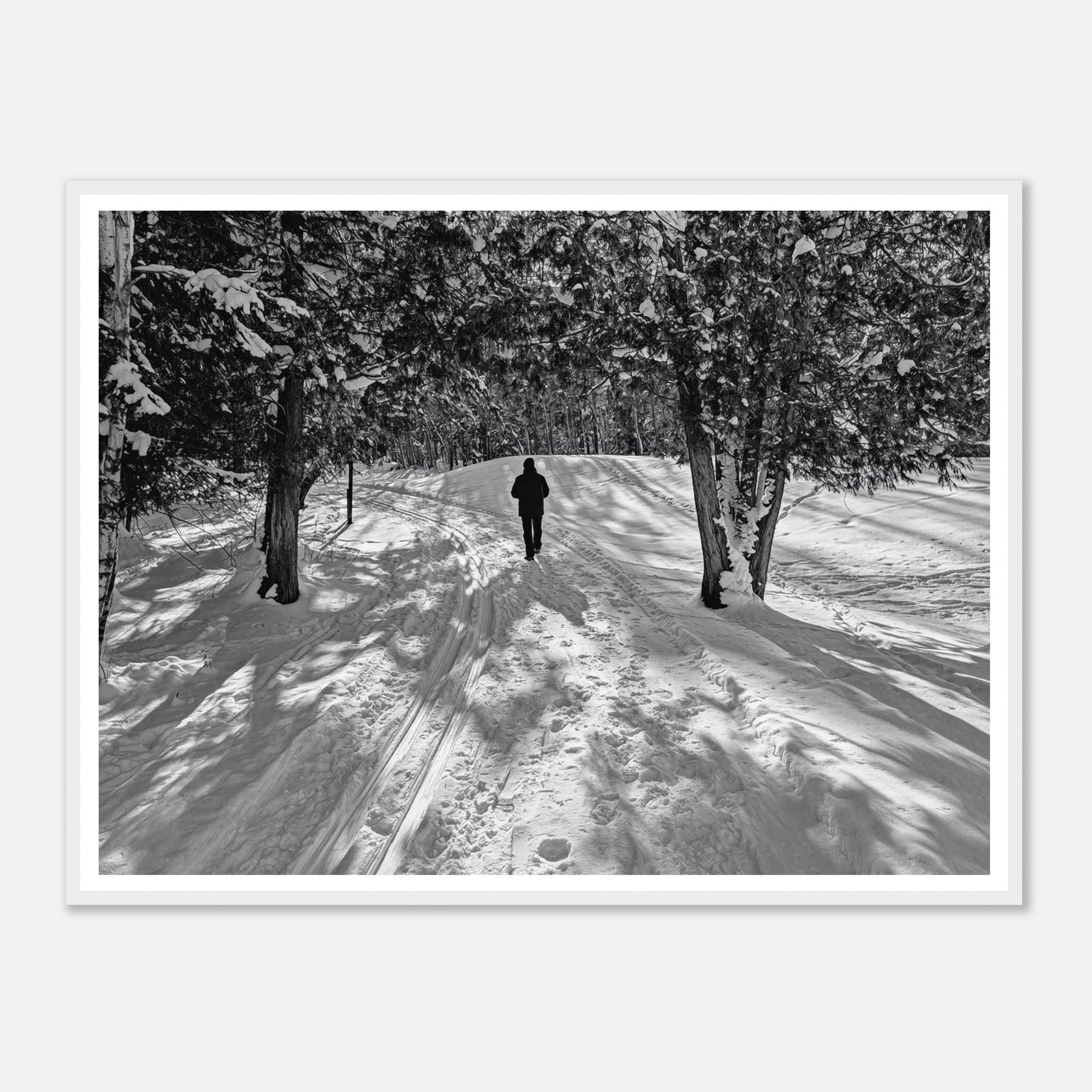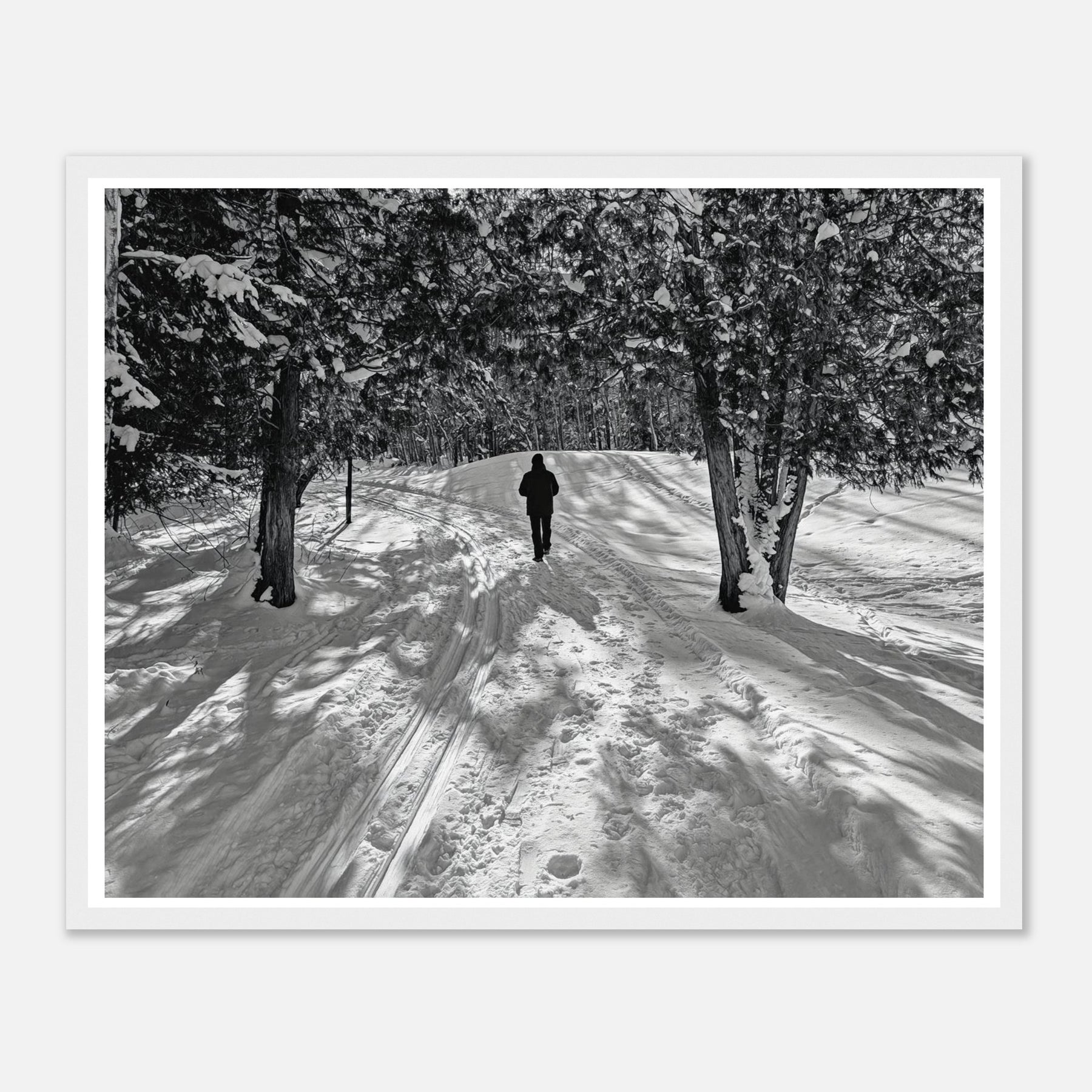 Immerse yourself in the serene beauty of winter with this black and white photograph of a snow-covered pathway in Bromont, Quebec. The image showcases a lone figure walking through a snowy landscape, framed by trees draped in fresh snowfall. This artwork evokes feelings of calmness and solitude, making it perfect for living rooms, bedrooms, or offices. Whether you're a nature lover or simply seeking a peaceful addition to your home decor, this piece is a timeless choice that will enhance your space.