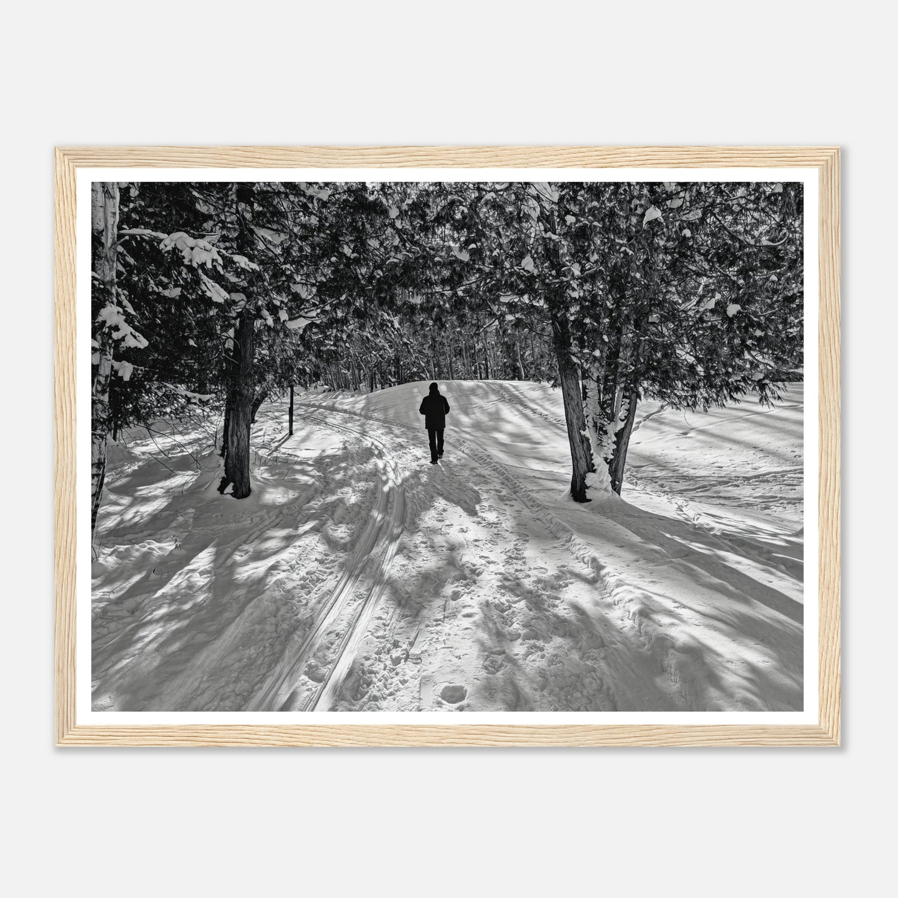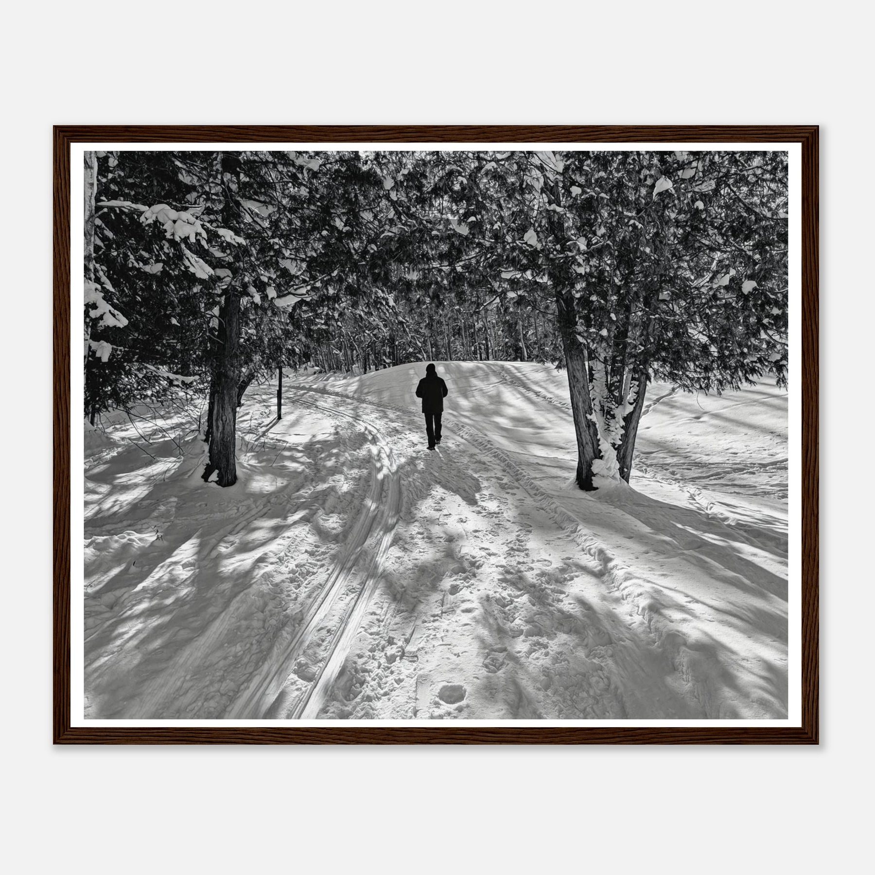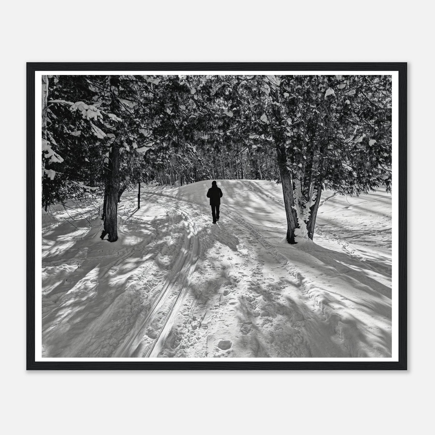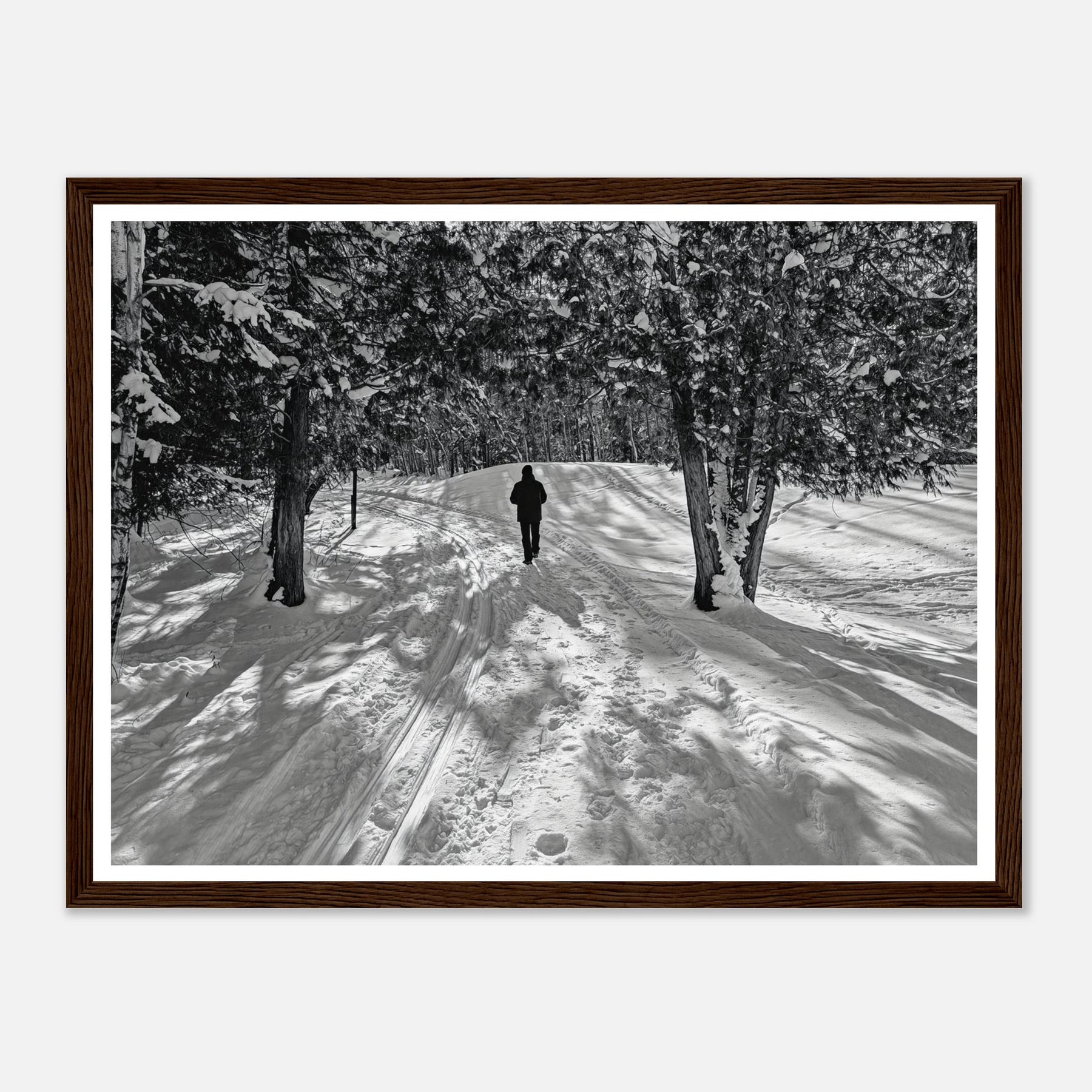 Immerse yourself in the serene beauty of winter with this black and white photograph of a snow-covered pathway in Bromont, Quebec. The image showcases a lone figure walking through a snowy landscape, framed by trees draped in fresh snowfall. This artwork evokes feelings of calmness and solitude, making it perfect for living rooms, bedrooms, or offices. Whether you're a nature lover or simply seeking a peaceful addition to your home decor, this piece is a timeless choice that will enhance your space.