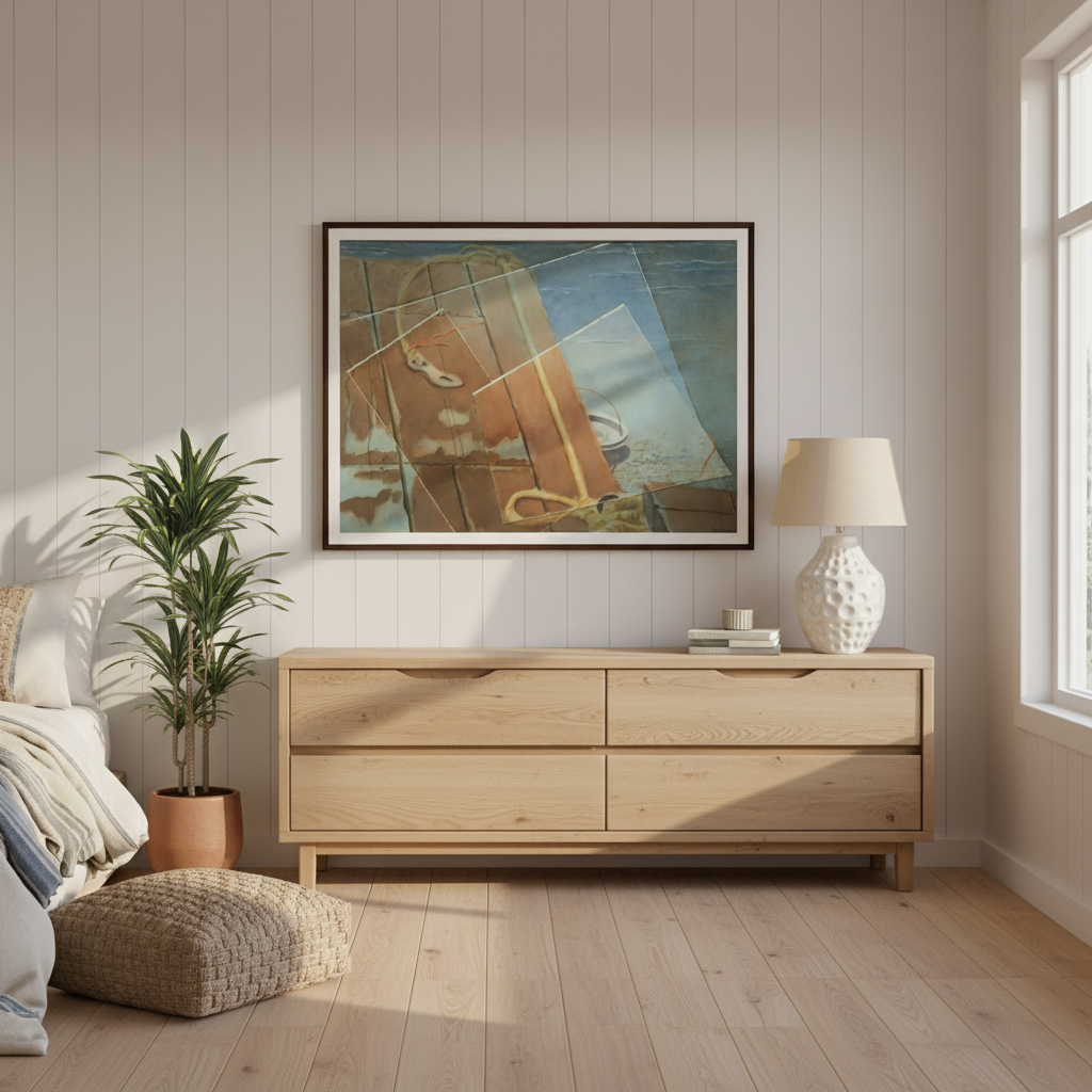 Living room with beige armchair, wooden console table, and framed abstract artwork on a gray wall - Bromont Media