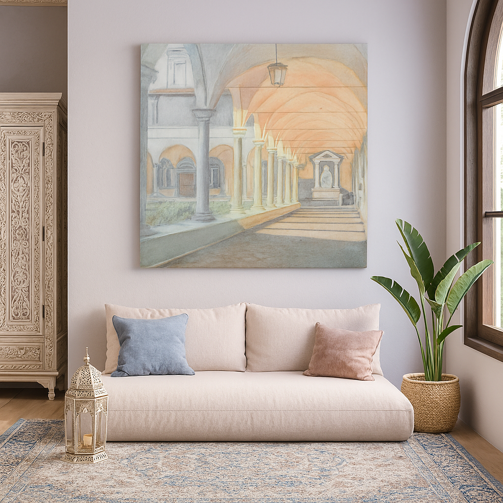 “Chiostro di San Lorenzo” captures the hushed elegance of a Renaissance cloister, where light spills beneath vaulted arches and casts rhythmic shadows across stone floors. This refined watercolor draws the viewer into its perspective. Perfect to add a pensive allure to any space, this piece evokes the timeless spiritual quietude of Florence’s architectural heritage.